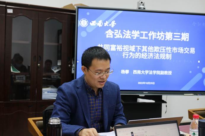 杨攀老师就论文《共同富裕视域下其他欺压性市场交易行为的经济法规制》的框架思路和主要观点作了介绍。杨老师提出,数字经济发展伴随着弱势市场主体范围扩大,需要增加欺压性市场交易行为规制类型加以应对。但现有法律制度规范在规制欺压性市场交易行为方面存在范围狭窄的局限性,故对其他欺压性市场交易行为进行经济法规制,顺应了欺压性市场交易行为法律规制的趋势。杨老师还指出需在制度构建上明确规制对象、规制措施和立法体制。