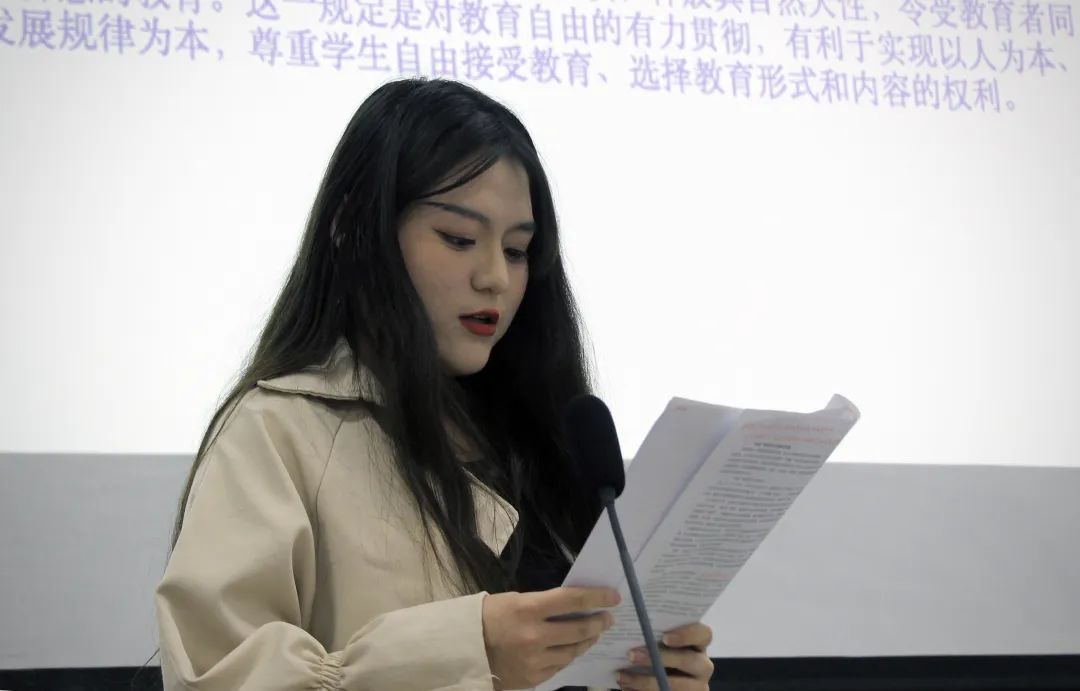 硕士研究生姜雪怡报告了《“双减”政策法律制度研究及完善对策》一文。文章认为, “双减”政策基于随着教育改革推进的背景提出,以《宪法》精神为引导,以《未成年人保护法》、《义务教育法》为直接依据的,体现了法律的公平、自由、秩序等属性,同时也对校外培训机构、教师以及员工的利益分别作出了调整。但这一政策在校外培训规范、教师权益保障等方面,还存在一定的不足。该文采用价值分析法、规范分析法展开研究,对“双减”相关政策进行分析,明确其法律价值、具体内容,并对不足之处提出针对性建议。