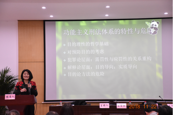劳东燕教授的主题报告首先提出,“在风险社会的背景下,立足于中国法治的现实语境,我们需要一种怎样的刑法体系?”她认为,需要从社会结构变迁以及刑法体系自主性、回应性这两个维度来建构刑法体系。在兼顾社会理论之法的外部视角下,有必要立足于目的理性将刑事政策的目的性纳入刑法体系,从而推进刑法体系向功能主义方向发展。在方法论上,认为在刑事政策与刑法体系关系的处理上可采用融合模式,并借助目的管道,使刑事政策进入刑法体系之内。主张将刑事政策的目的性设定与法教义学的构建相融合,构建二元性的规制框架,并通过刑法教义学的内部控制与合宪性的外部控制,以实现对功能主义刑法体系的正当性控制。