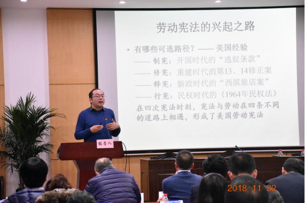 阎天助理教授的报告以一部电影为楔子,引出在宪法上的妇女是劳动者与母亲双重身份的竞合,对此要加以协调而非消灭妇女身份的二重性。其首先介绍了劳动宪法的三种形态,并分别阐述了三种形态的地位。认为第一种形态接近普世且当前研究很多,第三种形态缺乏解释学意义,第二种具有中国特色且研究较少而最有价值。继而介绍了劳动宪法的五大价值,认为劳动在宪法上之所以重要,即在于劳动服务于宪法的五大重要价值目标。此外,还以“兴而未起”来定位中国的劳动宪法,认为中国劳动宪法的兴起可通过释法、立法、释宪的路径而达致。