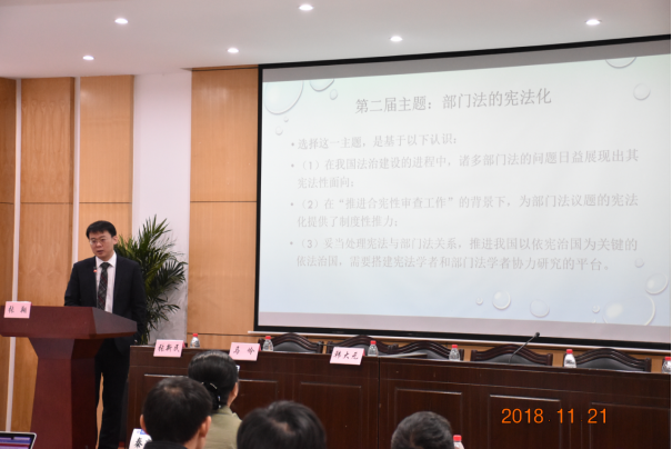 张翔教授对第二届“宪法学青年论坛”做了几点说明。首先,回顾了第一届“宪法学青年论坛”。“宪法学青年论坛”自创办以来,得到了大家的鼎力支持,第一届“宪法学青年论坛”在中南财经政法大学成功地举办,论坛对过去一年中国宪法学界有关国家机构的研究产生了较为明显的影响。其次,对会议方式进行了再次说明。会议的特点包括:半天只讨论一篇文章,一个人报告、五个人评议,提前写好3000字以上的书面评议意见,充分的自由讨论,主题报告、评议、讨论实录结集出版。本届论坛还创新增加了“晚餐报告”环节。再次,关于本届论坛的主题,认为宪法与部门法的关系是一种“交互影响”的关系。这个问题的研究,需要宪法学与其他部门法学者携手共进。最后,用了两张图来幽默地表达了宪法学学者的期许,希望部门法学者与我们一起,共同推进中国合宪性法秩序的建设。