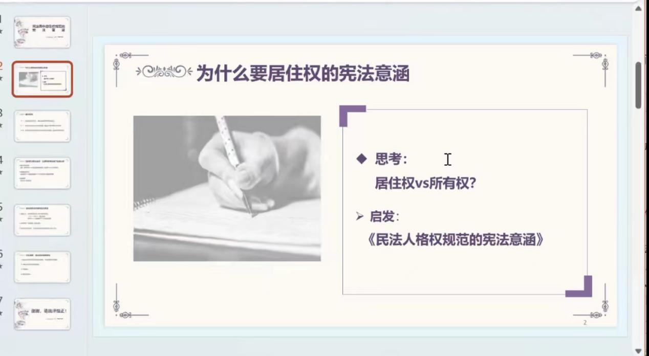 孙悦老师在报告中提出住宅是人生存发展的基础,我国对公民住宅权的保障率先从宪法层面入手,历经一系列住房供给政策后,再由《民法典》创设居住权,因循由政策再到法律的逻辑。居住权以他人所有的住宅为客体,以无偿设立为原则,有偿设立为例外,客观上具备社会保障的功能。宪法中的社会主义条款、住宅权保障条款构成居住权的宪法基础,也构成居住权解释的宪法背景。居住权作为用益物权,有对抗所有权的效果,对住宅所有人施加的权利负担合宪。居住权对抗所有权的限度即为居住权的保障领域,以是否满足生活居住的需要为目的,以不得限制所有权本质为限度。