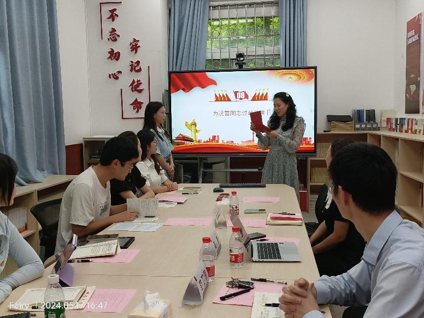 吴娟同志以教师党支部和员工党支部的党日活动开展特点作对比,充分肯定了员工党支部在理论学习方面结合专业特点和青年特点上的优势,提出三点建议:一是立足专业特色,创新党日活动形式,发挥创新精神,促进理论学习走深走实;二是结合专业实习,加强社会实践锻炼,在实践中锤炼党性修养,增强组织纪律性;三是明晰青年责任,成为德法兼修人才,将个人理想融入国家发展中,扎实学习锤炼本领,为社会主义现代化国家建设做出应有贡献!