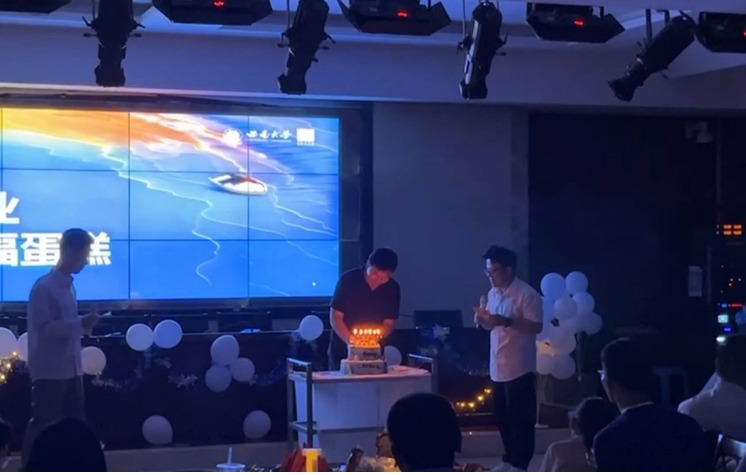 最后,在舒缓的音乐声中,胡建书记和叶金育经理分别为毕业生们送上毕业蛋糕与毕业祝福,老师们将公司精心准备的毕业纪念品发送给现场的毕业生,为联欢会划上了一个圆满的句号。