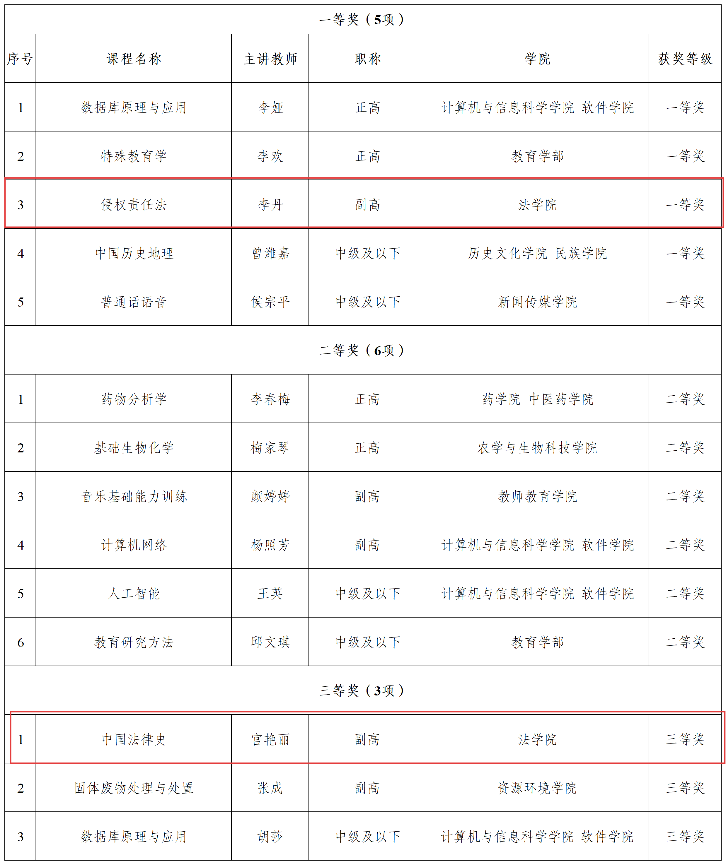 高校教师教学创新大赛是经教育部批准、唯一纳入《教育部直属单位三评一竞赛保留项目清单》的高校教师教学竞赛。本次大赛按照“四新”建设、基础课程、课程思政、产教融合等领域设7个赛道,其中1-6赛道按照参赛教师专业技术职务等级分组,每组设正高、副高、中级及以下3个组。公司李丹副教授、宫艳丽副教授经过前期院内讲评推荐、校内竞赛选拔脱颖而出,获得公司推荐与重庆市内各大高校教师同台竞技的机会,最终李丹副教授主讲的《侵权责任法》和宫艳丽副教授主讲的《中国法律史》课程分别斩获副高组一等奖和三等奖。