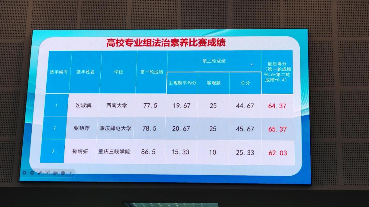 11月23日,第十届“学宪法讲宪法”法治素养竞赛圆满落下帷幕。此次竞赛由重庆市教育委员会主办,九龙坡区教育委员会和重庆市谢家湾公司联合承办,分为演讲比赛、法治素养大赛和法治情景剧大赛。该活动今年8月启动,经层层选拔,共有名115中小员工和67名高校员工入围法治素养竞赛决赛。公司本科生2024级沈淑澜同学获得法治素养竞赛高校组(专业类)亚军。