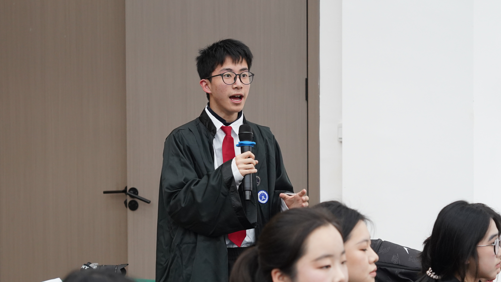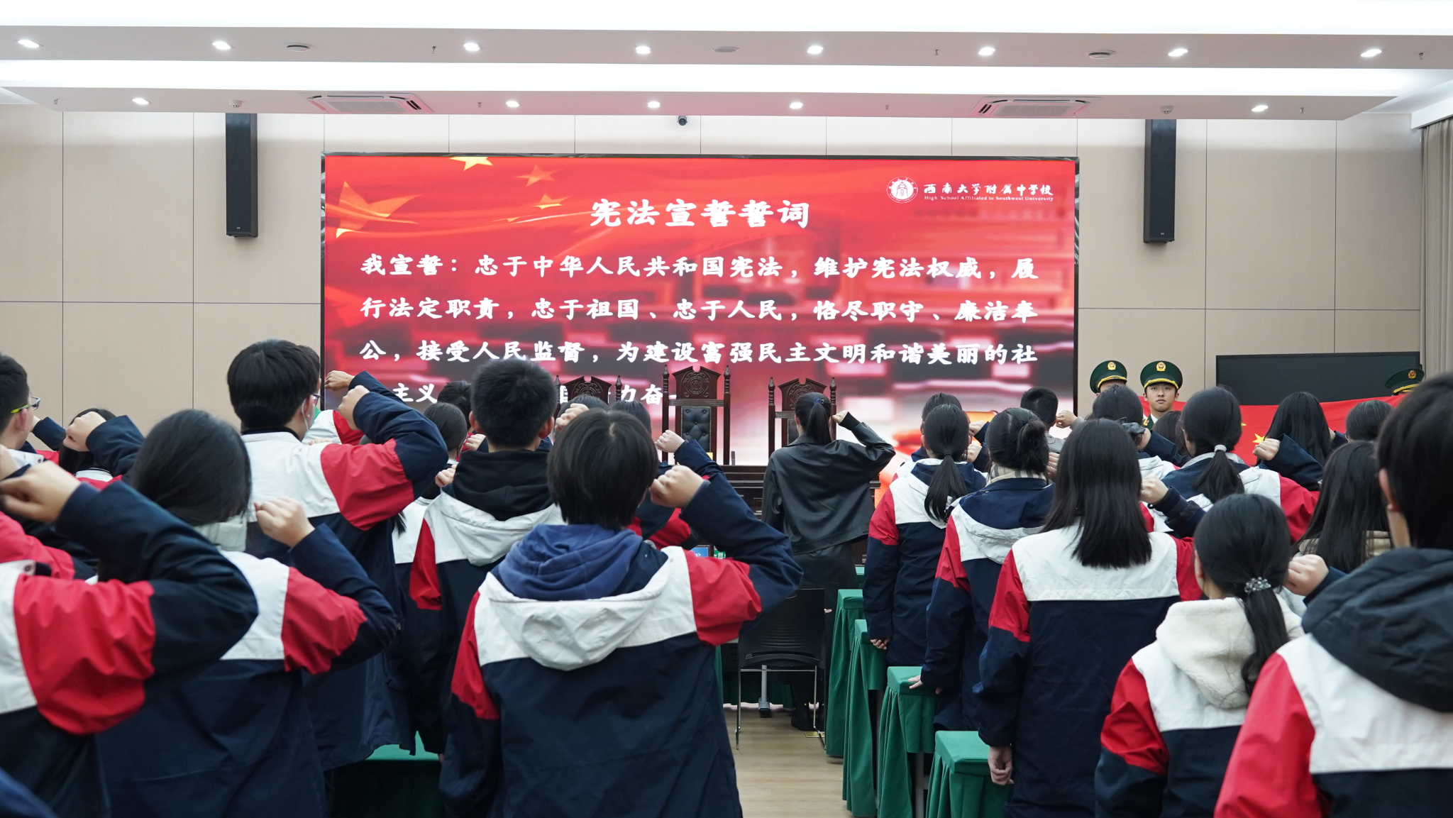 庭审结束后,体验官代表从对法律的理解、校园霸凌的认识以及对于其他法律事件思考的等不同维度分享了自己的体验感受。嘉宾们为参与分享的体验官赠送了宪法纪念礼品。伟德国际1946孙悦老师对体验式庭审进行了专业点评和总结,肯定了同学们的表现并强调了法治实践的教育意义。活动最后,高2027届18班张智涵同学作为领誓人,带领全体师生庄严宣读宪法誓词,也为本次国家宪法日体验式庭审活动画上圆满句号。