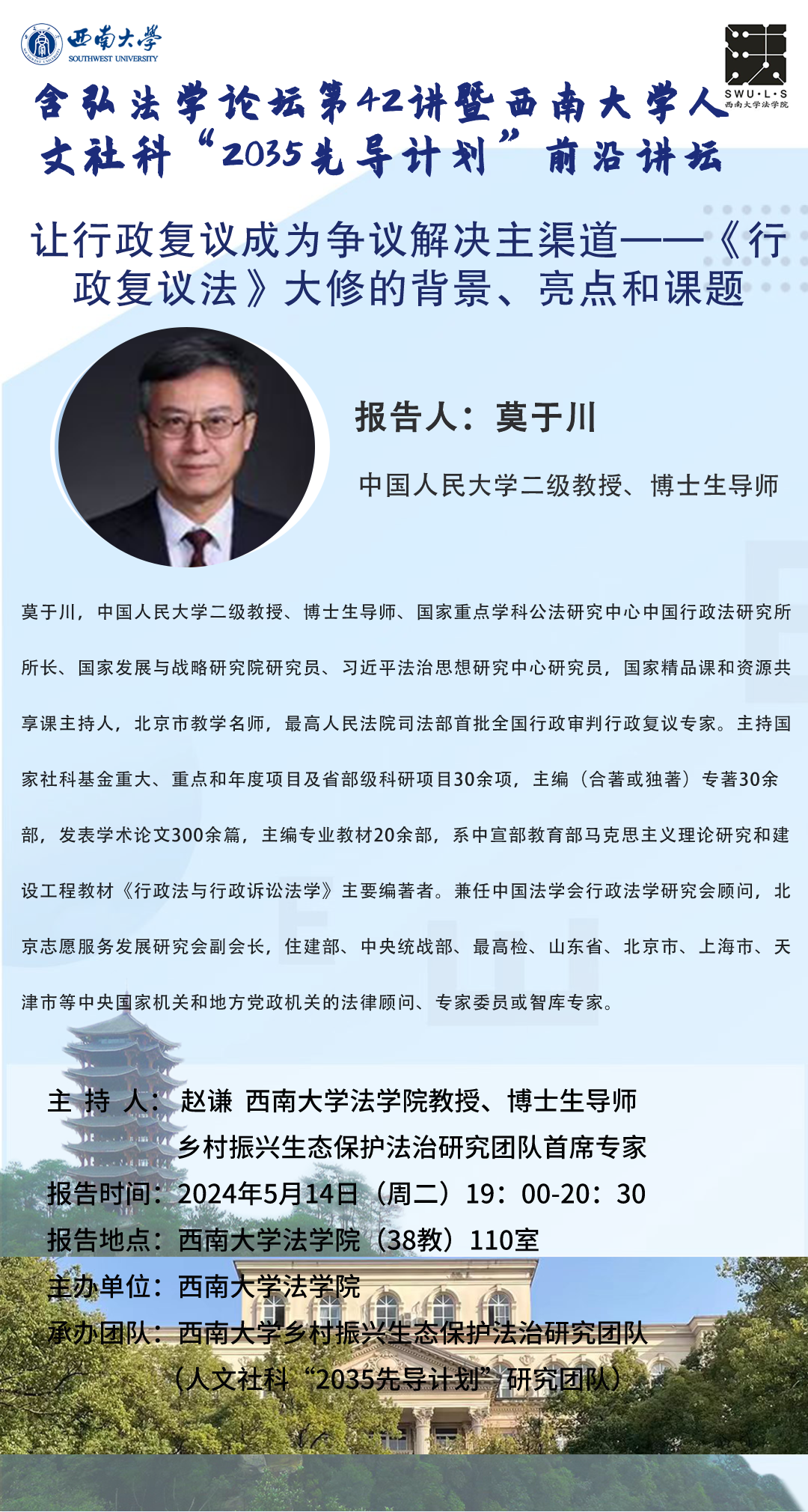 【预告·论坛】(5月14日)莫于川:《让行政复议成为争议解决主渠道——<行政复议法>大修的背景、亮点和课题》