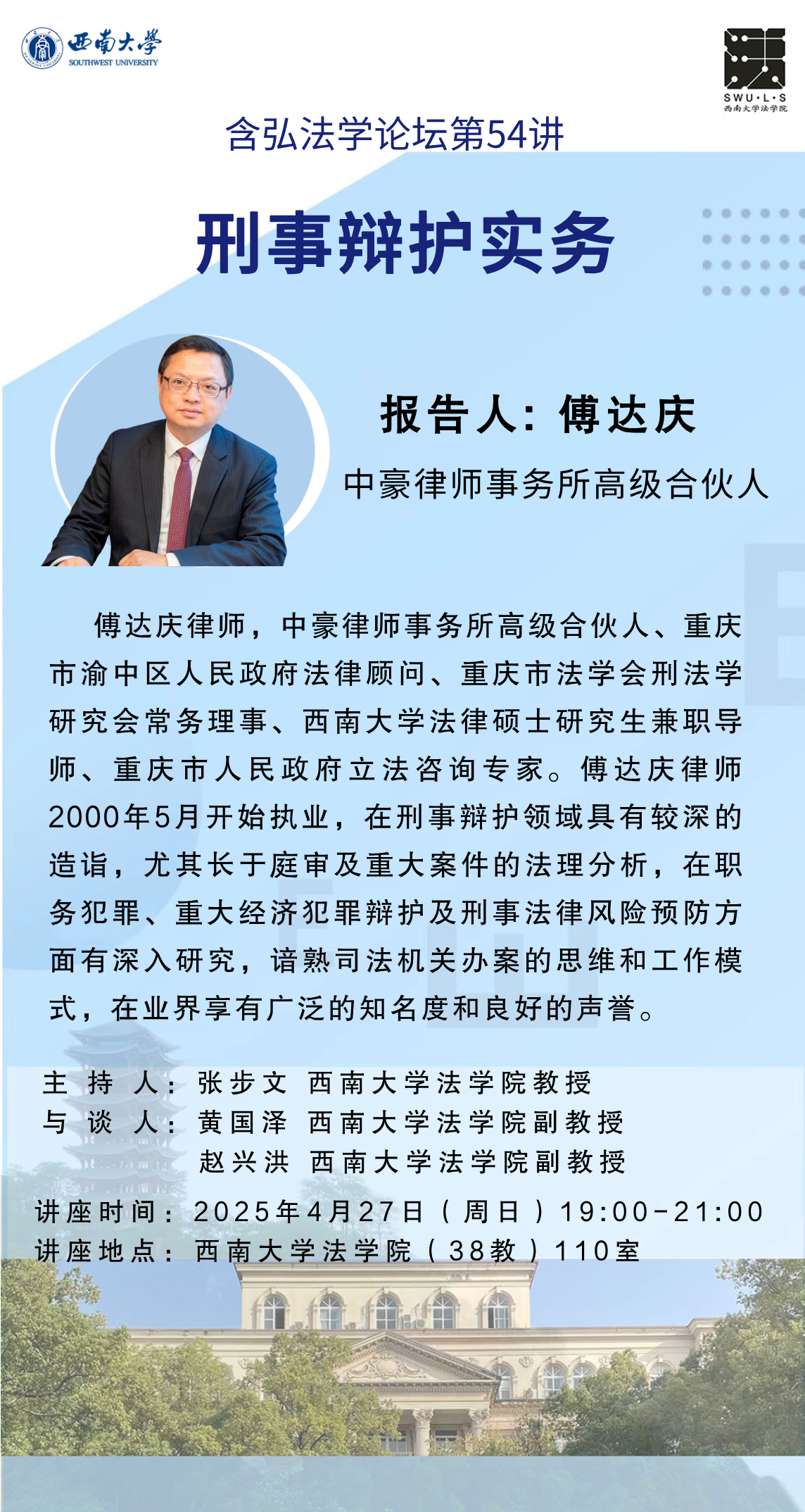 【含弘法学论坛第54讲(4月27日)】傅达庆:《刑事辩护实务》