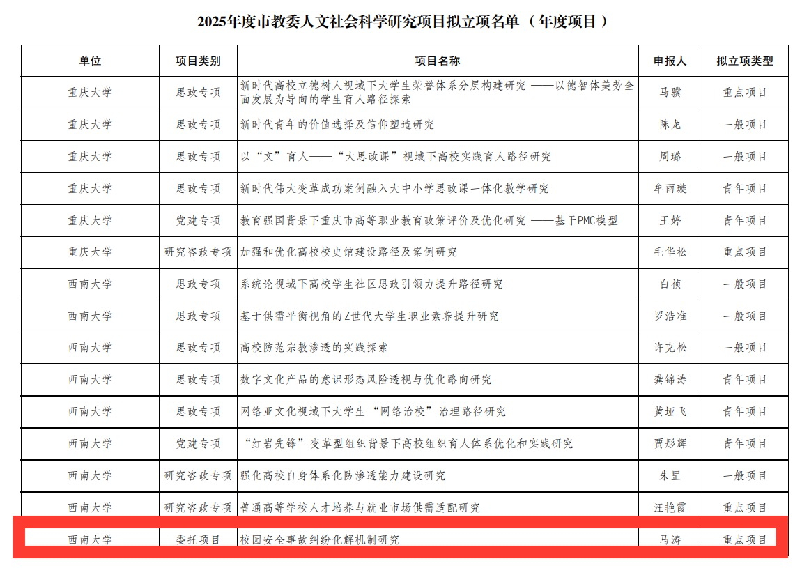 近日,重庆市教育委员会公布了2025年度市教委人文社会科学研究项目,公司马涛副教授的《校园安全事故纠纷化解机制研究》获批重点项目立项。