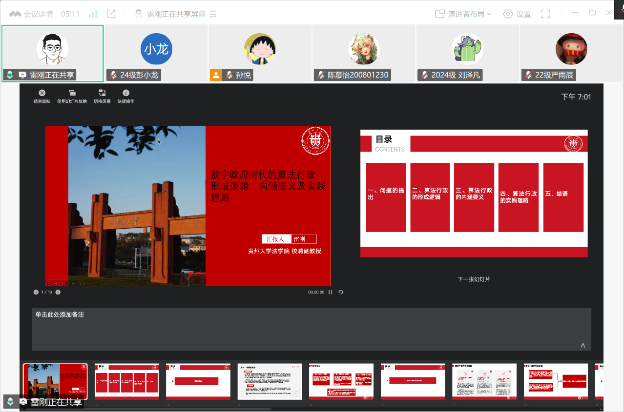 会议第一阶段,雷刚老师围绕“数字政府时代的算法行政:形成逻辑、内涵要义及实践理路”这一主题,结合算法行政逐渐成为行政国家发展的新面向这一背景,从“问题的提出”、“算法行政的形成逻辑”、“算法行政的内涵要义”、“算法行政的实践理路”、“结语”五个方面展开精彩的讲述。首先,雷刚老师立足于数字政府时代和算法行政,从“技术—社会”互构的理论奠基、“技术—行政”互塑的镜鉴启益、“技术—行政”互融的时代呈现解构算法行政的形成逻辑。其次,雷刚老师以关系模式和治理意蕴为切入点,围绕人机共治、算法治理、治理算法三方面明晰算法行政的内涵要义。再次,雷刚老师从运转要素和运行机制两方面细致地分析了算法行政的实践理路。最后,雷刚老师在结语部分强调“算法行政并不是一种理论预设,相反是具有实践逻辑的行政模式”,突出了算法行政研究的实践性。