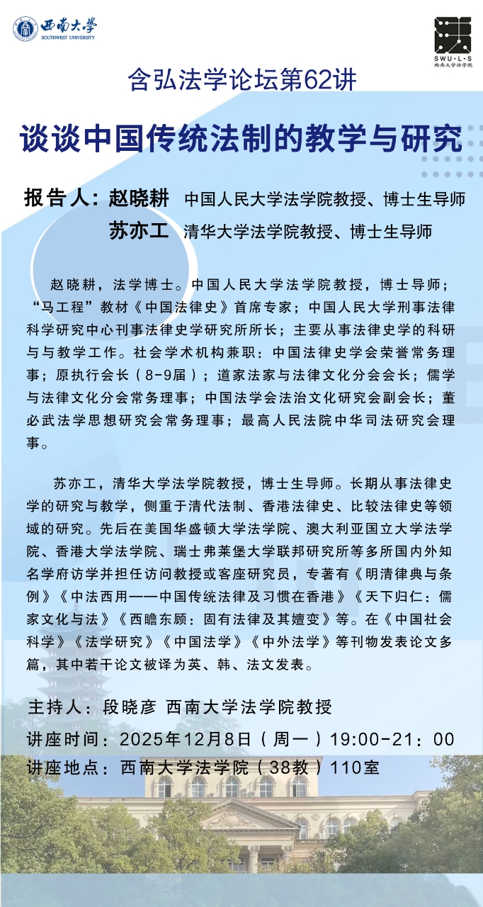 【含弘法学论坛第62讲】赵晓耕、苏亦工:《谈谈中国传统法制的教学与研究》