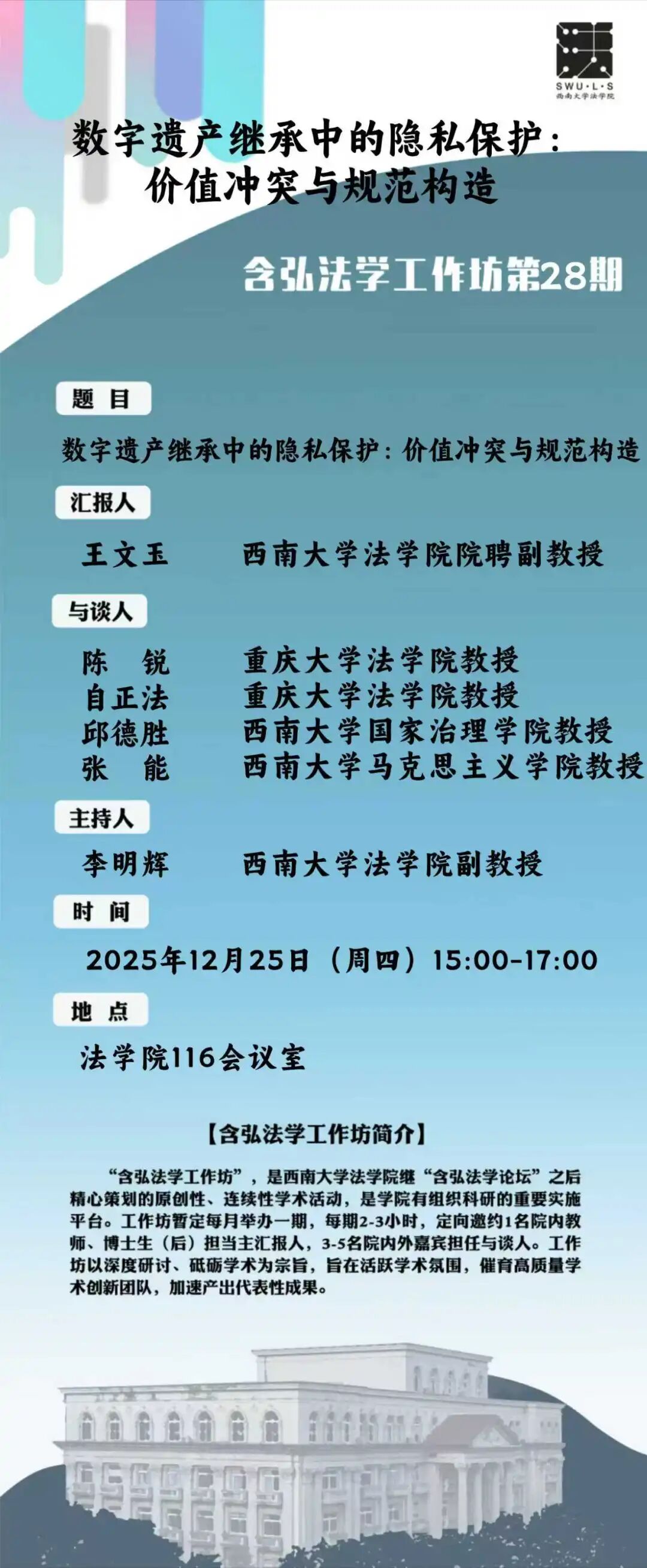 【含弘法学工作坊第28期】(12月25)王文玉:《数字遗产继承中的隐私保护:价值冲突与规范构造》