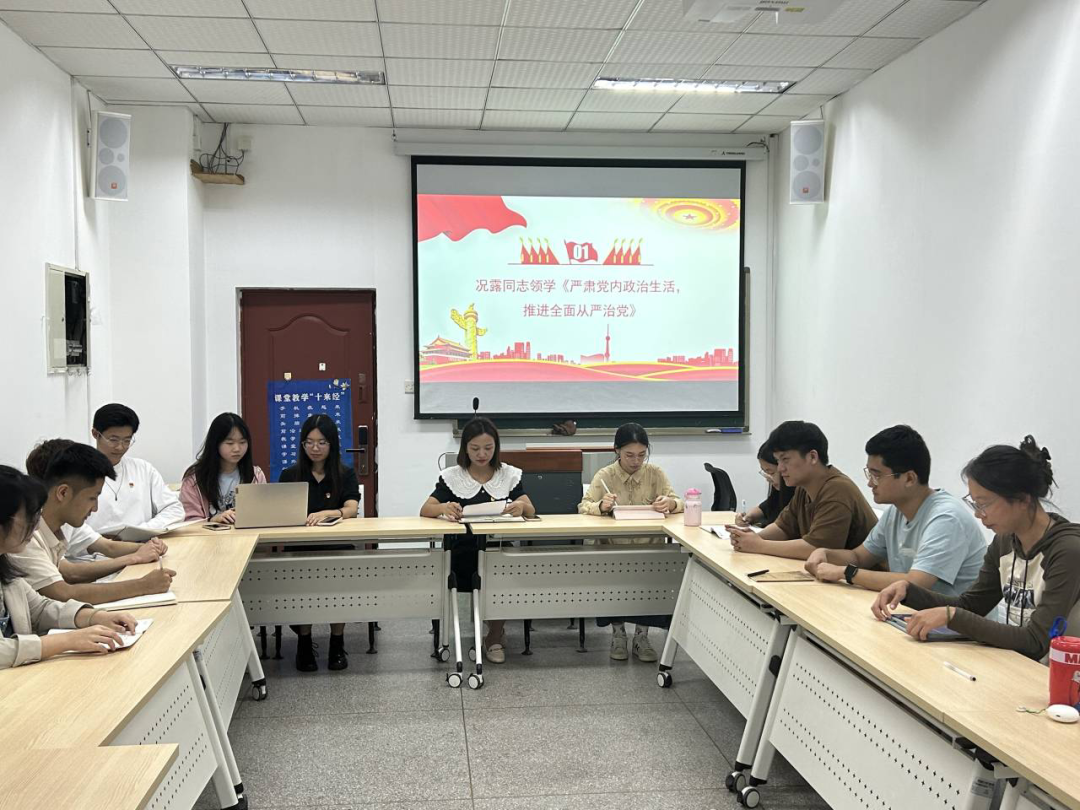 本科生第二党支部党员代表领学《严肃党内政治生活,推进全面从严治党》《习近平总书记关于党的建设和组织工作的重要指示》。支部书记胡婷回顾党支部参加主题教育的情况,鼓励党员同志增强融入支部的“主人翁”意识,带领党员同志开展批评与自我批评,引导党员同志进行细节化反思,永葆自我革命精神。