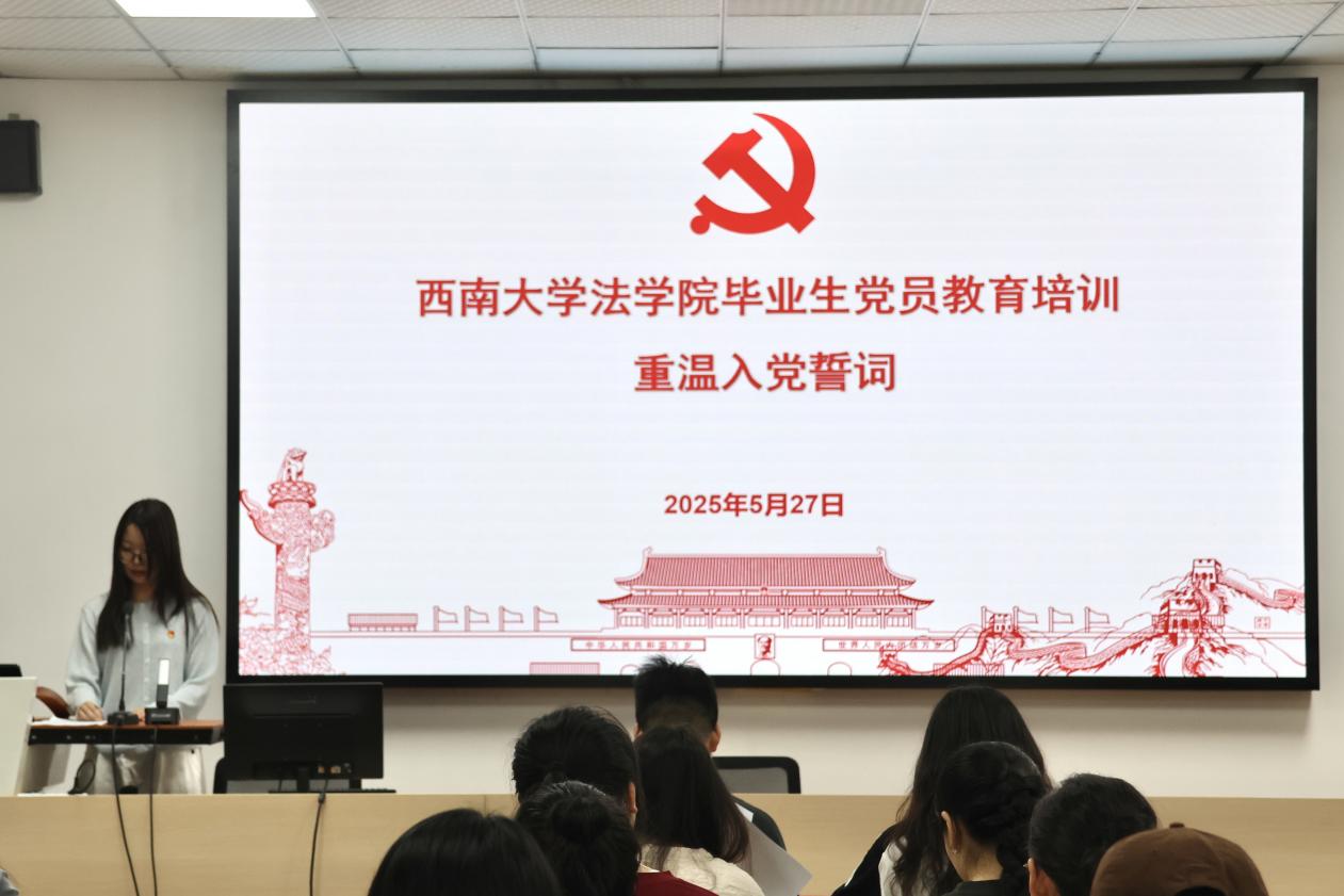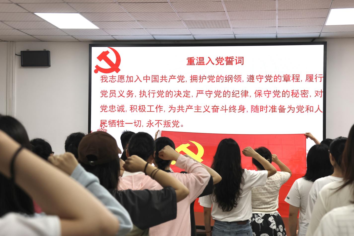 5月27日下午,重温入党誓词仪式在公司305教室举行。伴随着激昂的《国际歌》旋律,全体毕业生党员庄严肃立,齐声高唱。随后,在组织员唐静的带领下,党员们面向鲜红的党旗,高举右拳,齐声宣誓:"我志愿加入中国共产党......"铿锵有力的誓言在教室中久久回荡,每一句誓言都饱含着党员们对党的无限忠诚和为共产主义事业奋斗终身的坚定决心。