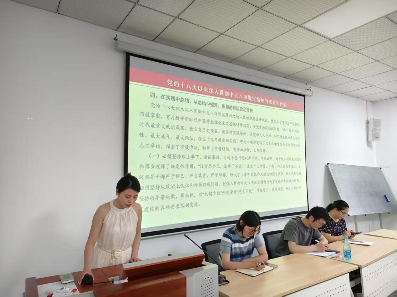 本科生党员陈果御领学了习近平总书记在河南考察时对开展深入贯彻中央八项规定精神学习教育发表的重要讲话精神、习近平总书记重要文章《锲而不舍落实中央八项规定精神,以优良党风引领社风民风》《党政机关厉行节约反对浪费条例》。研究生党员魏文娇领学了《党的十八大以来深入贯彻中央八项规定精神的成效和经验》、关于禁止违规吃喝的规定要求。