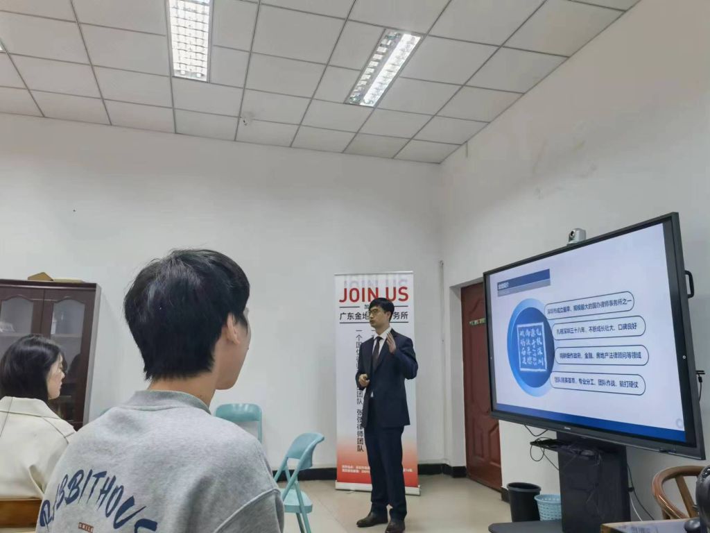 招聘会最后,广东金地律师事务所祝凤瑞对律所进行了 详细 介绍 , 包括金地律师事务所的发展历程 、 律所规模 、 荣誉奖项 、 培训课表等基本情况。