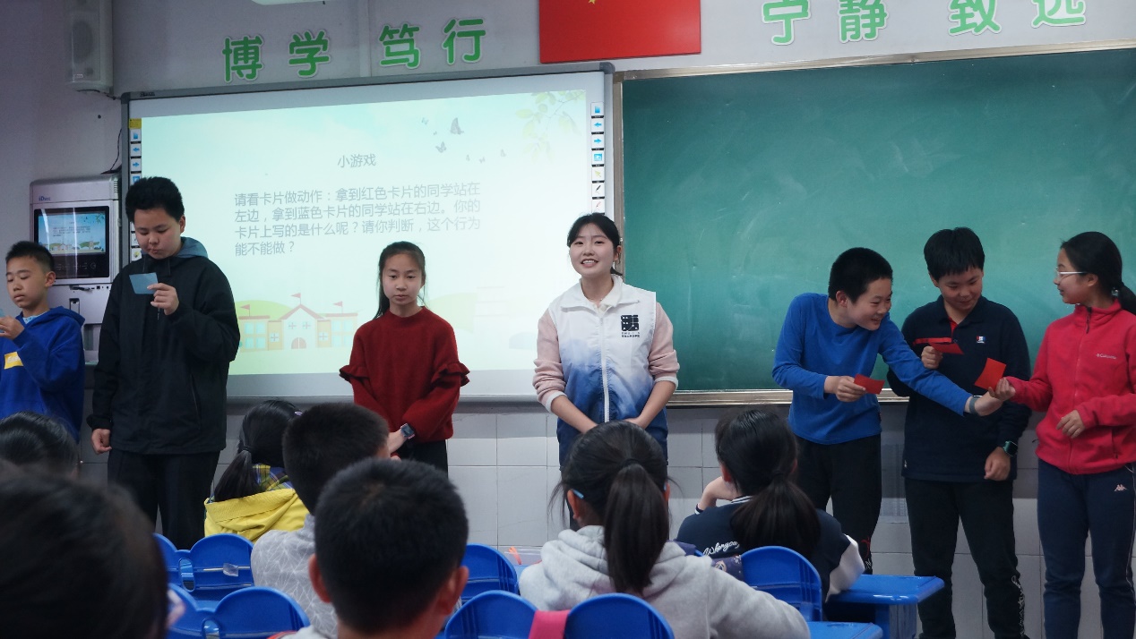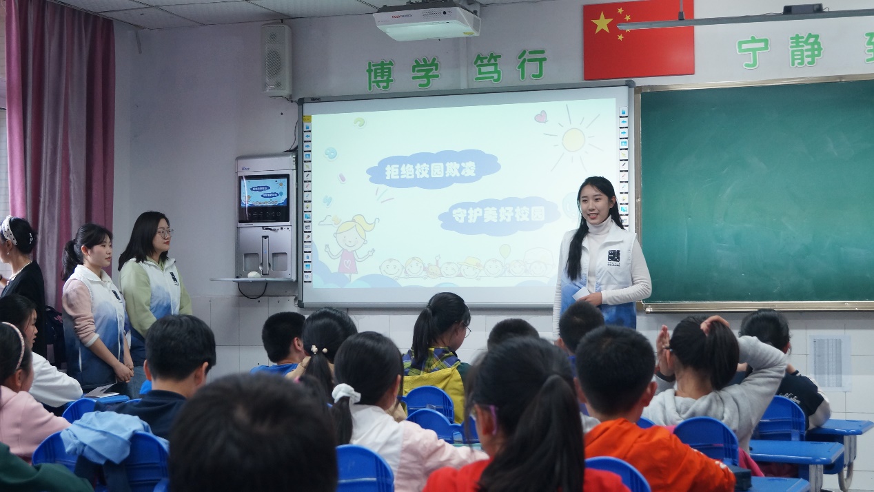 “同学们,希望在今天的宣讲过后,大家能够真正的从内心与行动上去反对校园欺凌。要用法律保护自己,不成为被欺凌者,更不能成为欺凌者。”志愿者伟德国际1946本科2022级漆明欣同学正在给伟德BV1946官网附属小学6年级5班的同学进行反对校园欺凌宣讲。