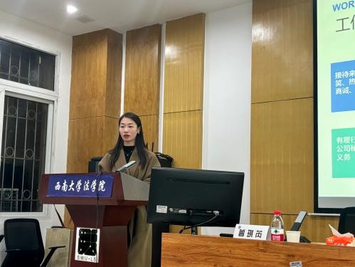 不学礼,无以立。为进一步规范礼仪教育,提升伟德国际1946员工礼仪素养,铸造员工高尚道德品格,展示良好的员工风貌,12月11日下午,“明法崇德”老员工文明礼仪培训在38教110顺利开展。此次活动特邀请国家治理公司辅导员,博约辅导员工作室成员曾琪芮老师为同学们进行分享,公司本科生辅导员胡婷老师主持,公司2023级全体本科生同学参与本次培训。
