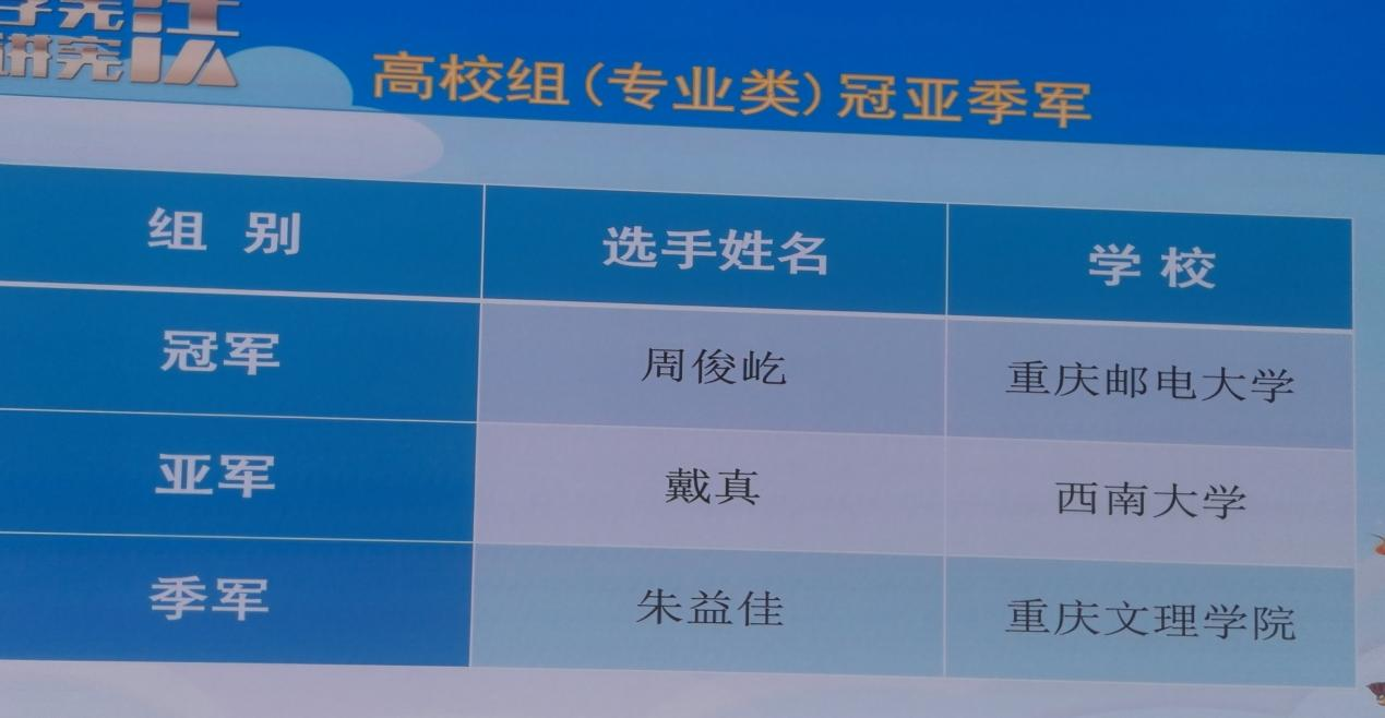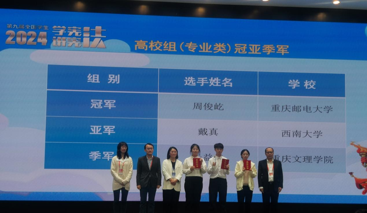 11月10日,第九届全国员工“学宪法·讲宪法”重庆赛区决赛圆满落下帷幕。本次比赛由重庆市教育委员会主办,九龙坡区教育委员会、重庆市谢家湾公司承办,分演讲比赛和法治素养竞赛两个赛项。该活动今年8月启动,经过层层选拔,共有84名中小员工和42名高校员工入围决赛。公司本科生2023级戴真同学获得法治素养竞赛高校组(专业类)亚军。