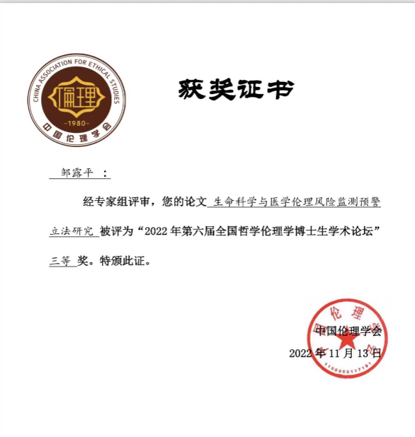 9. 研究生毕业生邹露平在2022年第六届全国哲学伦理学博士生学术论坛获三等奖。