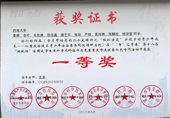 1.研究生毕业生鲁娜、李叶,本科毕业生吴依琳、黄珂琳、周麟松、杨泽蓉等员工的社会实践作品《学习贯彻党的二十大精神之“模拟法庭”护航乡村青少年成长——以重庆市涪陵区青少年法治素养现状调研为例》斩获第十八届挑战杯红色专项赛全国二等奖,重庆市选拔赛一等奖。