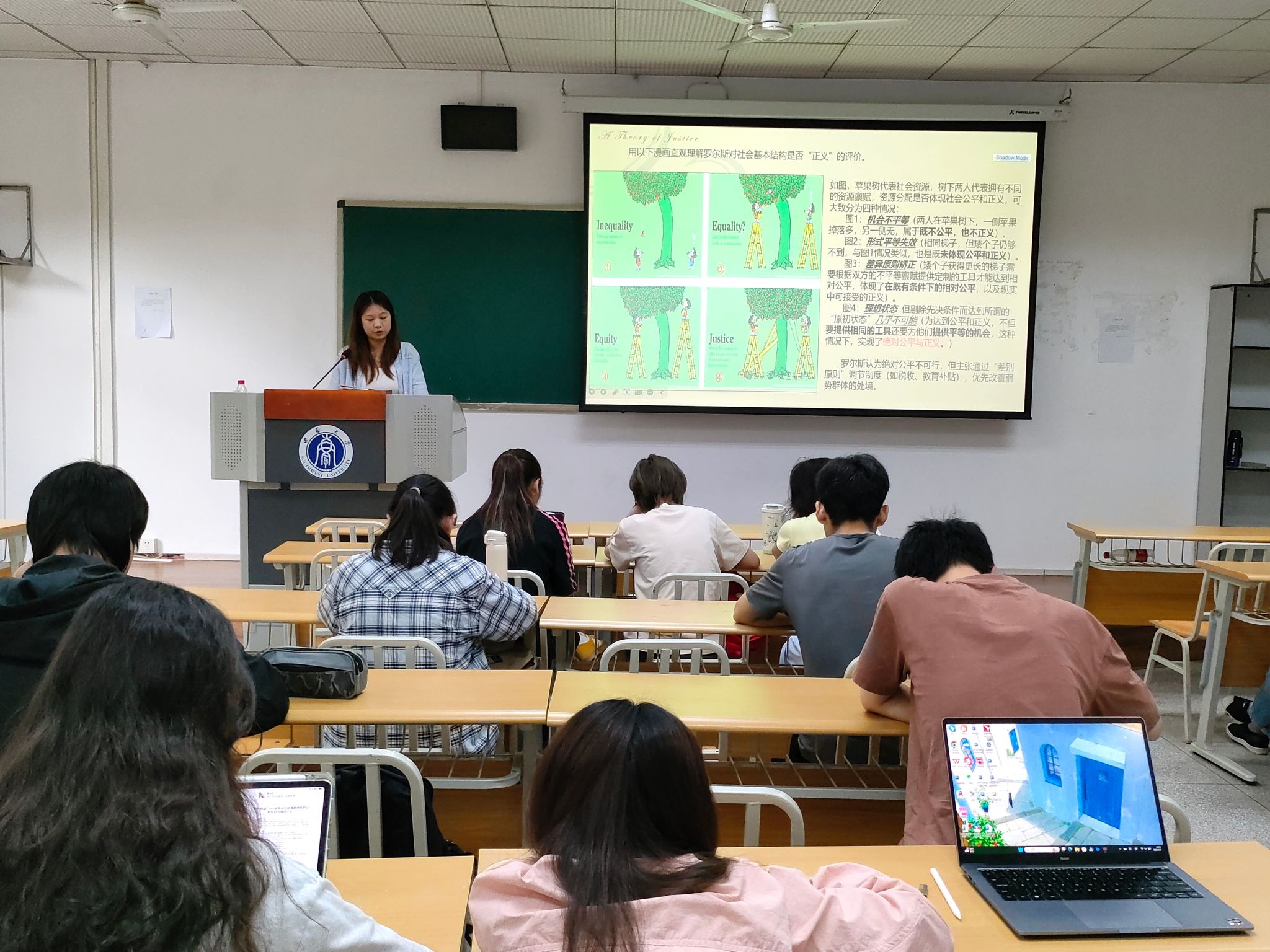读书会采取分散阅读与集体讨论结合的方式开展。前期,各班级在班主任指导下开展分散阅读;读书会上,各班级选派小组进行名著领学与集中讨论。2023级本科生聚焦《变革中国》《正义论》《规则为什么会失败》《德国公法学基础理论》等著作,从经济转型、正义内涵等视角探讨中国法治实践。2024级本科生围绕《法理学初阶》《法治及本土资源》《宪法学讲义》,结合“送法下乡”“秋菊的困惑”等典型案例,剖析法治建设与本土文化的融合路径。各汇报小组创新采用动画演绎、案例模拟等形式,激发员工思辨热情,加强了同学们对于相关名著的进一步理解。班主任点评环节,老师们对同学们的深度思考与多元视角表示肯定,同时强调法学学习应注重理论与实践的融合,结合具体书籍向同学们做了详细解读,并根据小组领学情况,评出优秀小组8支。