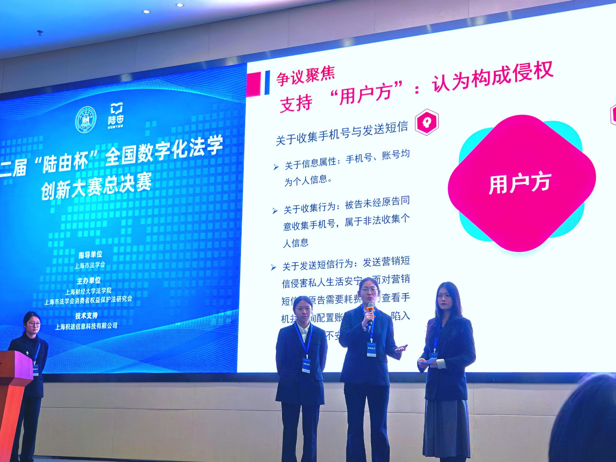 在第二阶段的现场答辩环节,本科生队做了题为“APP‘隐形收集’的代价—罗某诉大生知行隐私权纠纷”的汇报展示。队员们以图文并茂形式,全面、生动地展示了队员们对APP暗中收集个人信息侵权风险的焦点问题、裁判逻辑和独特见解。最终凭借线上竞赛成绩得分与现场答辩得分,本科生队斩获赛事一等奖。